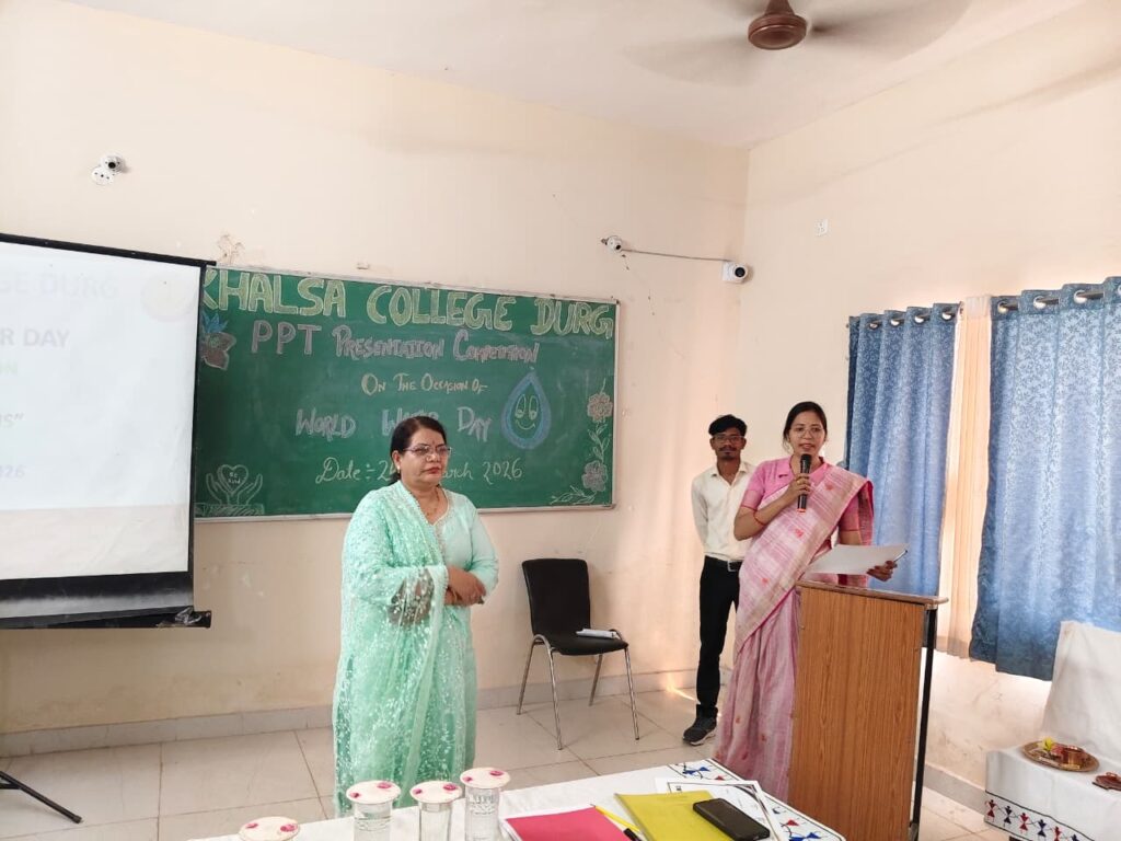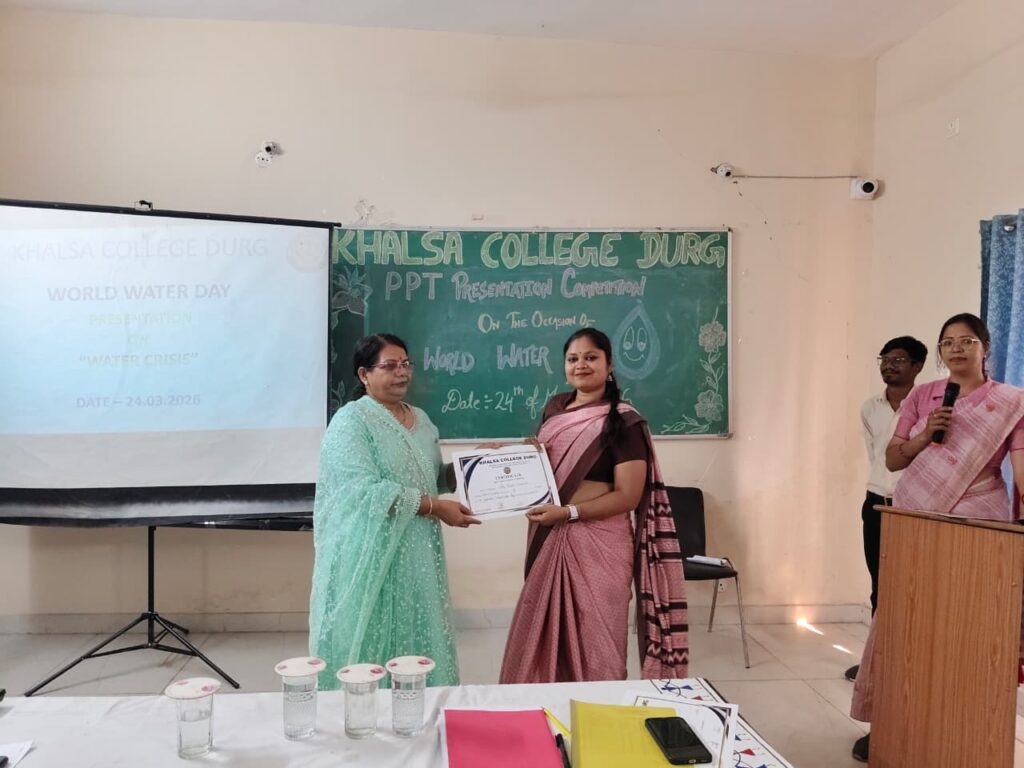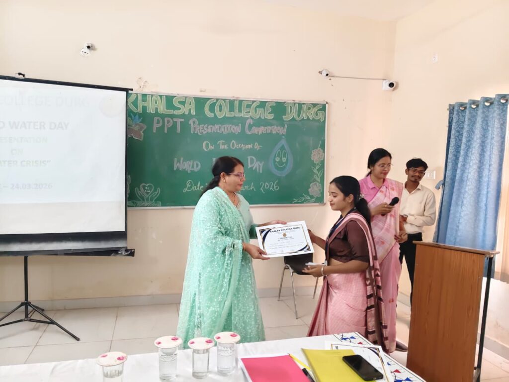 खालसा महाविद्यालय में दिनांॅक 24/03/2026 को ईको क्लब द्वारा विश्व जल दिवस के अवसर पर पीपीटी प्रेजेंटेशन प्रतियोगिता का आयोजन किया गया। जिसमें बी.एड. द्वितीय सेमेस्टर और बी.एड चतुर्थ सेमेस्टर की 8 विद्यार्थियों ने भाग लिया और प्रत्येक विद्यार्थी के पीपीटी का विषय जल के प्रति जागरूकता व संरक्षण संबंधी विभिन्न उपाय और समाधान लिए हुए था। बी.एड. द्वितीय सेमेस्टर की अनुषा का पीपीटी ‘‘जल के व्यर्थ उपयोग व प्रदूषण के प्रति जागरूकता लाना’’ व पुनः उपयोग का उपाय बहुत ही सराहनीय था। इस प्रतियोगिता में बी.एड. चतुर्थ सेमेस्टर की छात्रा परिधि यादव का ‘‘जल के प्रति जागरूकता व पीने योग्य जल का संरक्षण व उपयोग’’ पर सावधानी का प्रोजेक्ट बहुत ही उपयोगी था। चतुर्थ सेमेस्टर के नवनीत साहू का ‘‘जल संरक्षण व उपयोग’’ पर एवं जल का कृषि के समय उपयोग और उपयोग के लिए विभिन्न उपाय पर पीपीटी निर्माण बहुत ही प्रशंसनीय था। इस प्रतियोगिता में निर्णायक के रूप में डॉ. मनीष वर्मा (सहायक प्राध्यापक), दिव्या सिंह रहे। प्रतियोगिता के सफलतापूर्वक समापन के बाद प्राचार्य डॉ. सुनीता बोकडे़ जी ने पीपीटी बनाने व प्रस्तुति के समय क्या-क्या सावधानी एवं निर्माण संबंधी नियम बताए और प्रतिभागियों को भविष्य में होने वाले कार्यक्रम में इसी तरह उत्साहपूर्वक भाग लेने को कहा।